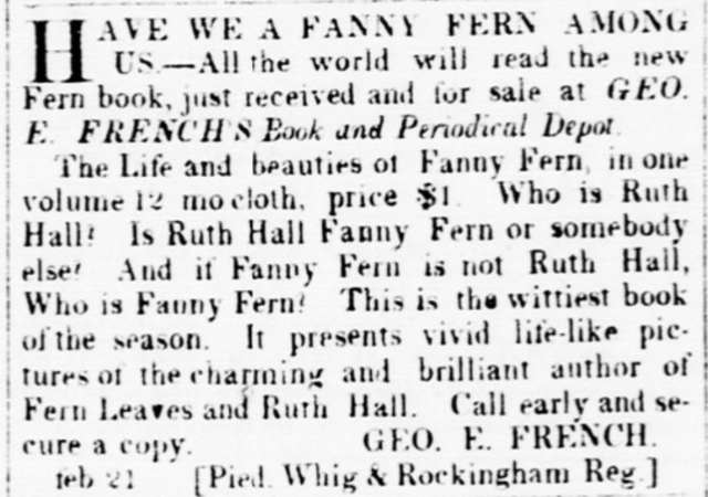 The Life and beauties of Fanny Fern, in one volume 12 mocloth, price $1. Who is Ruth Hall? Is Ruth Hall Fanny Fern or somebody else? And if Fanny Fern is not Ruth Hall, Who is Fanny Fern? This is the wittiest book of the season. It presents vivid life-like pictures of the charming and brilliant author or Fern Leaves and Ruth Hall. Call early and secure a copy.