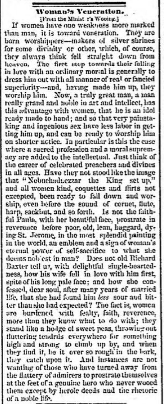 If women have one weakness more marked than another, it is towards veneration. They are born worshippers,—makers of silver shrines for some divinity or other, which, of course, they always think fell straight down from heaven. The first step towards their falling in love with an ordinary mortal is generally to dress him out with all manner of real or fancied superiority; and having made him up, they worship him. Now a truly great man, a man really grand and noble in heart and intellect, has this advantage with women, that he is an idol ready-made to hand; and so that very painstaking and ingenious sex have less labor in getting him up, and can be ready to worship him on shorter notice. In particular is this the case where a sacred profession and a moral supremacy are added to the intellectual. Just think of the career of celebrated preachers and divines in all ages. Have they not stood like the image that "Nebuchadnezzar the king set up," and all womankind, coquettes and flirts not excepted, been ready to fall down and worship, even before the sound of cornet, flute, harp, sackbut, and so forth? Is not the faithful Paula, with her beautiful face, prostrate in reverence before poor, old, lean, haggard, dying St. Jerome, in the most splendid painting of the world, an emblem and sign of woman's eternal power of self-sacrifice to what she deems noblest in man? Does not old Richard Baxter tell us, with delightful single-heartedness, how his wife fell in love with him first, spite of his long, pale face,—and how she confessed, dear soul, after many years of married life, that she had found him less sour and bitter than she had expected? The fact is, women are burdened with fealty faith, reverence, more than they know what to do with; they stand like a hedge of sweet-peas, throwing out fluttering tendrils everywhere for something high and strong to climb by,—and when they find it, be it ever so rough in the bark, they catch upon it. And instances are not wanting of those who have turned away from the flattery of admirers to prostrate themselves at the feet of a genuine hero who never wooed them, except by heroic deeds and the rhetoric of a noble life.