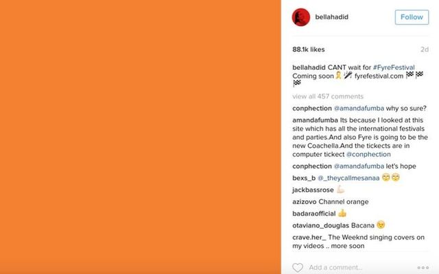 Orange “stopper” tile used by influencers paid to promote the Fyre Festival. hbellahadid Instagram am, 2017.
