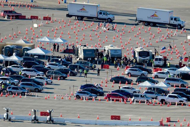 Drive-thru COVID-19 testing site with traffic cones at Los Angeles’ Dodgers Stadium. Photo: Shutterstock.