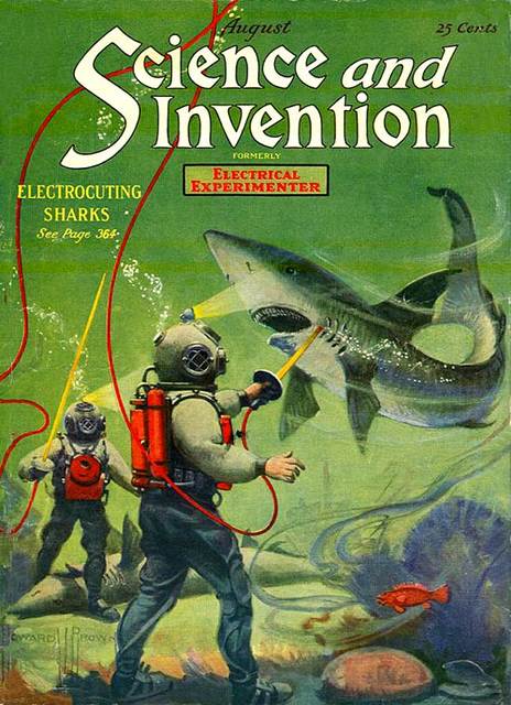 In white type, the masthead features above a water-color image of a two deep-sea divers at the bottom of a green ocean wearing diving helmets from the turn of the twentieth century. Each diver has a wand, connected to the surface by a red wire, that can direct electricity. Their attention is turned to a large shark that is swimming in their direction. In the background one of the divers is stepping over the corpse of a shark they killed. The caption reads, “Electrocuting Sharks.”