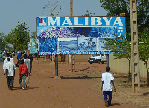 Evidence of Gadaffi-backed Libyan beneficence was plentiful at the time in Bamako. Libya’s name decorated the façades of banks and prominent hotels, including the iconic Hotel de l’Amitié, one of the city’s few high-rises. A new district of government offices on the city’s left bank bore the name “Malibya,” a sign intended to inspire a sense of pan-African solidarity, though more than a few saw it as an affront to Malian sovereignty—once again, anxiety mixed with celebration. This was particularly true in the region of Ségou, some 200 miles north of the capital, where “Malibya” signified a furtive bilateral agreement to cede, virtually free of charge, 250,000 acres of land in Mali’s prime zone of industrial agriculture, the Office du Niger, to Libya for the development of export crops and livestock (see Whitehouse 2013d, 42) (Figure 21). This was part of a broader—dare I say “neocolonial”?—trend in sub-Saharan of selling (or conditionally conceding) rights to domestic land production to foreign interests (see Martiniello 2013).