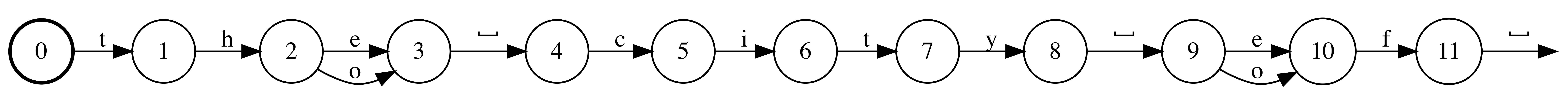 where the brackets are the common shorthand for a set of alternative characters. This regular expression represents the set or union of 26 = 64 different strings, i.e., it would match any of the 64. The figure shows the beginning of the representation of this regular expression as an FSA. Each node in the graph represents a state. The labels on the directed arcs leaving each state show the characters that the automaton will accept when in that state. After accepting a character, the automaton traverses the corresponding arc to a new state.