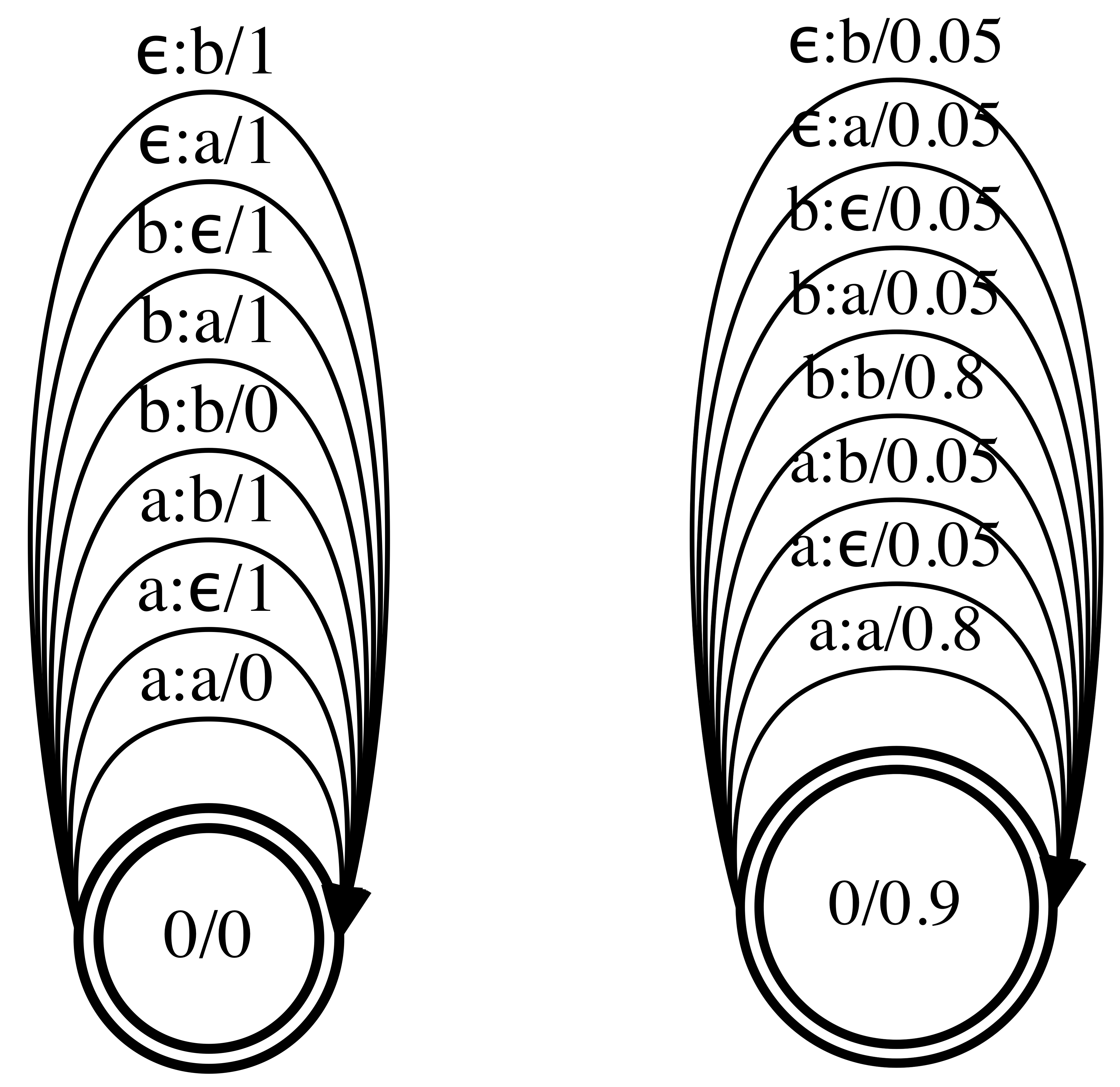 Figure 7. Finite-state transducer for Levenshtein edit distance over the two-symbol alphabet Σ = {a, b}. Left, traditional Levenshtein distance; right, probabilistic Levenshtein distance. The empty string ε in the input allows insertion and in the output indicates deletion. When the input and output characters match, the cost is 0; otherwise, the cost is 1.