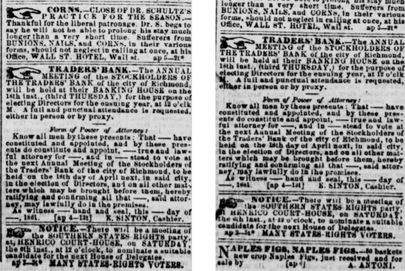 Figure 3. Portions of the same advertisement for a bank from issues of the Richmond Daily Dispath on two successive days, April 5 (left) and 6 (right), 1861. We observe the same broken B in ‘Trader’s Bank’. On April 6, a new ad for “Naples Figs” was inserted at the bottom of the column, moving these ads up.