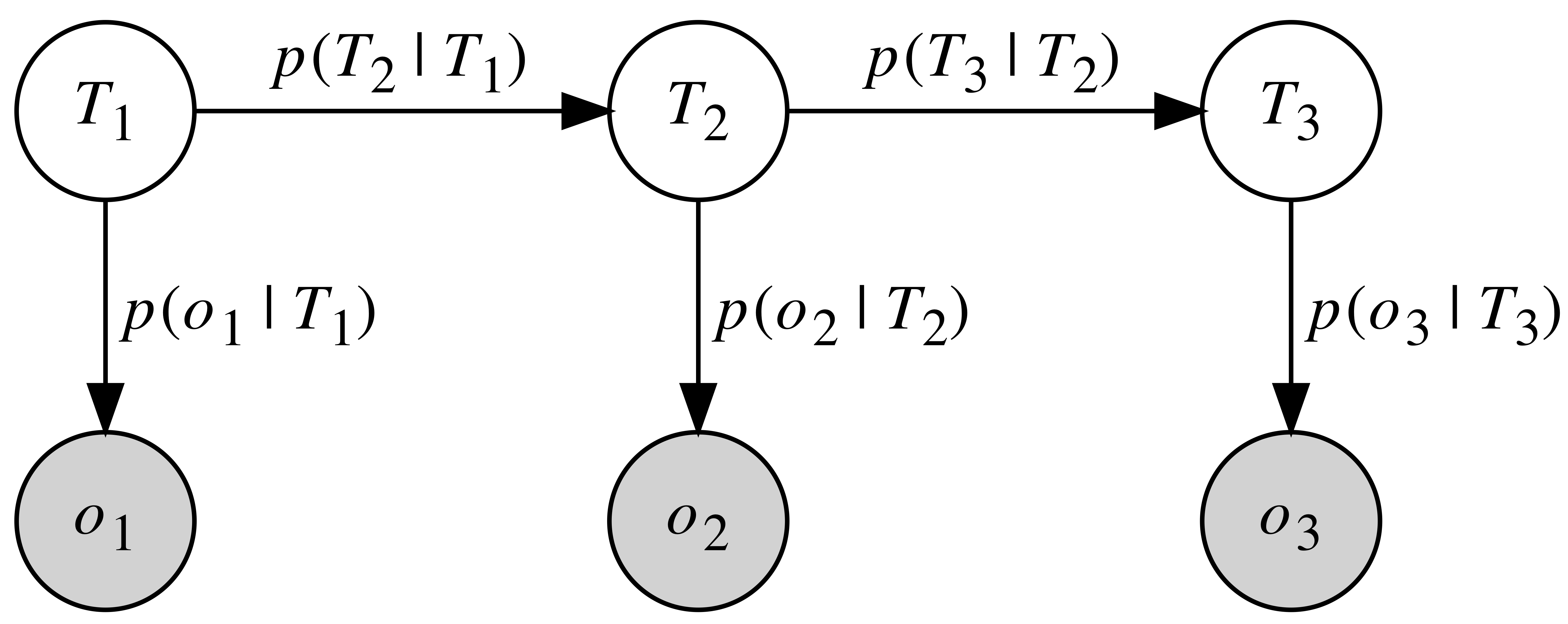 p(T1, … , T7, o1, … , o7) = p(o1 | T1) p(T1) ∏i = 27 p(oi | Ti) p(Ti | Ti − 1)