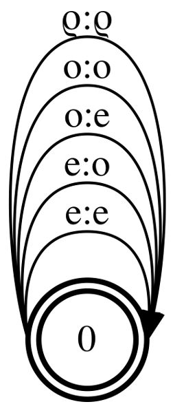 How then should we define the conditional distributions p(Ti | Ti − 1) and p(oi | Ti)? A convenient way of describing a relation between two regular expressions is a finite-state transducer (FST). Formally, an FST describes a pair of strings—conventionally called the input and output strings—and thus looks like an FSA with a pair of symbols on each arc. To take an example, say that we want to take the string S, the city of Biebmond, to bo