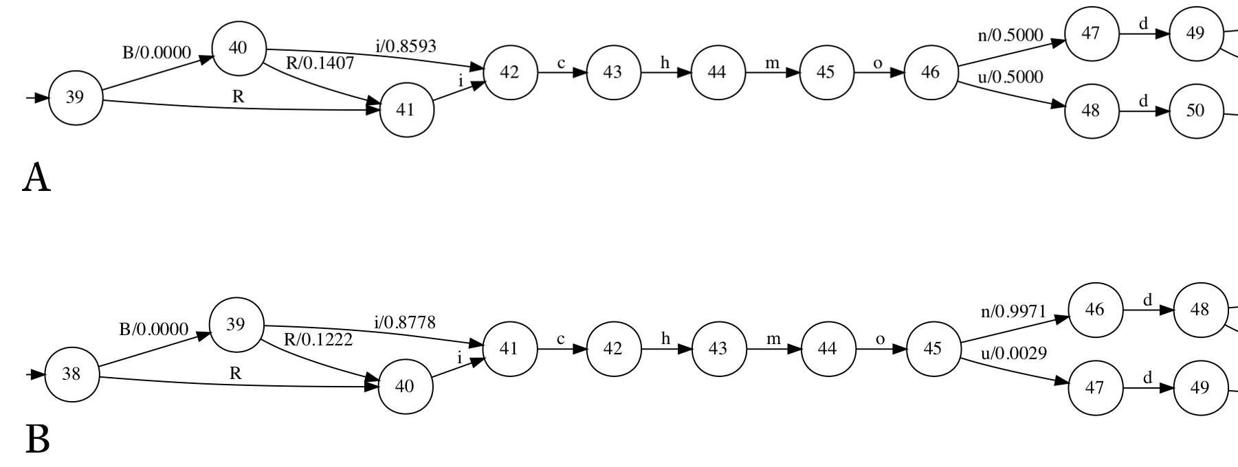 Figure 8. Diagrams of language models represented as finite-state automata. Language models represent our beliefs about the correct transcription of a string by an OCR system (as in the second machine) and are also used to send messages among neighboring variables (i.e., texts) in the model (as in the first machine). Arcs without weights have probability (numerically close to) 1. A, Part of the message sent from the sixth string to the seventh: By this point, the evidence for the readings n