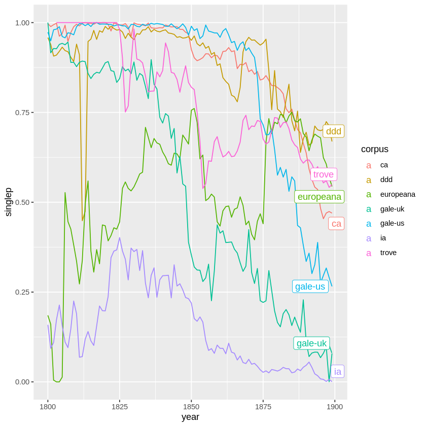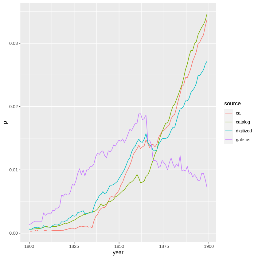 To make the different curves comparable, each one is normalized over the time interval, so that the area under each curve sums to 1. We see that both the Chronicling America and the Gale US collections oversample newspapers, relative to the catalog, from before 1870 and undersamples them after 1870. This is also true of the whole set of digitized newspapers, which includes data from ProQuest’s American Periodicals Series and the Internet Archive collections. Chronicling America, at least, still accurately reflects the fact that there are more papers published in years after 1870 than before; for Gale US, there is an absolute decline in the number of digitized papers after the Civil War, even though more papers existed after that date historically.