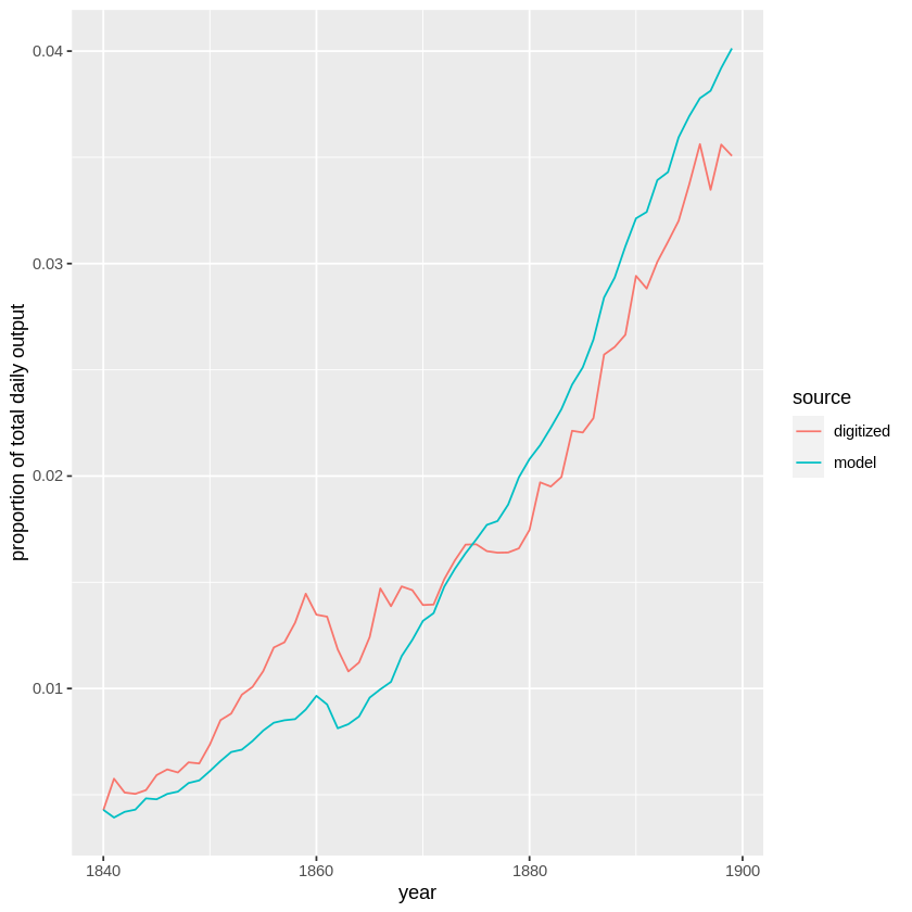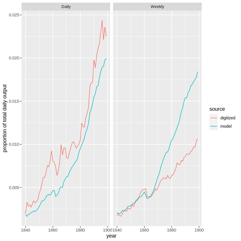 Looking at the same data another way, we see that the digitized sample attributes a greater rate of daily newspaper output to daily papers over weekly papers for the entire nineteenth century. As shown by the dashed lines, however, the model estimates that the total rate of output for daily papers only surpasses weeklies in the 1890s.
