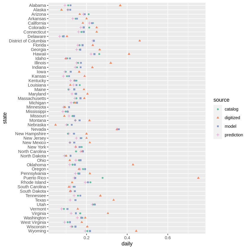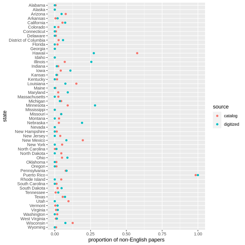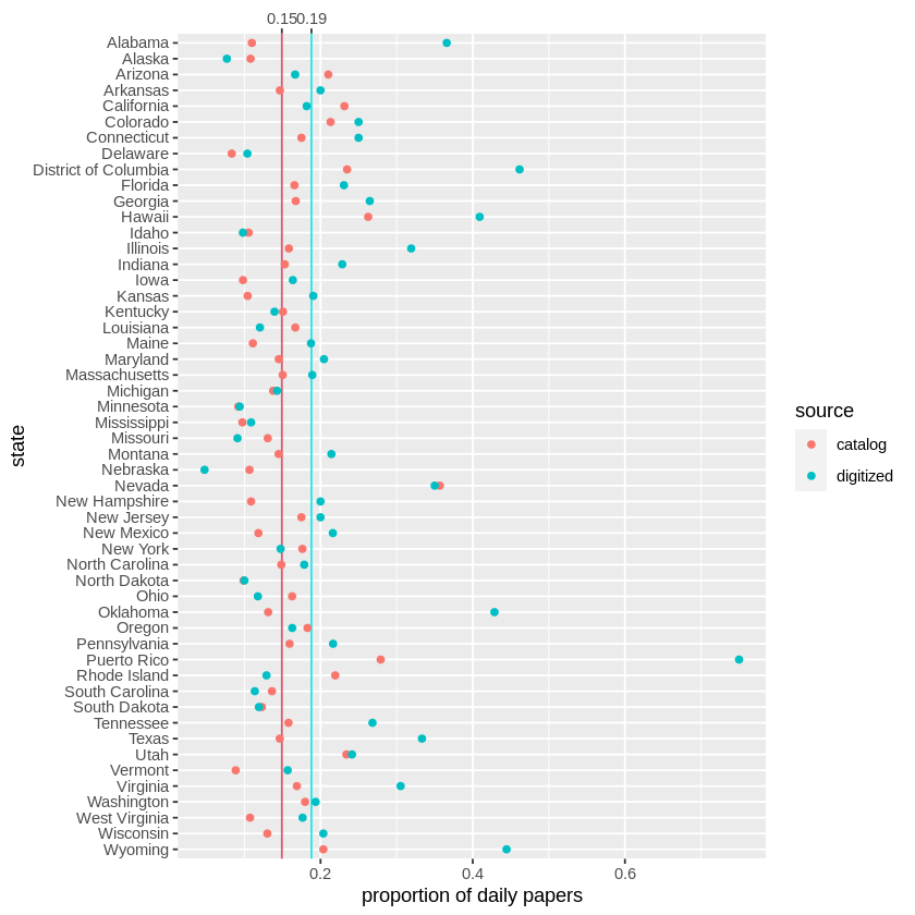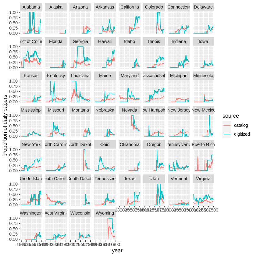 The National Digital Newspaper program provided funding and infrastructure support from the National Endowment for the Humanities and the Library of Congress to state-level digitization efforts.1 States have applied to the NDNP at different times, and some states have received more rounds of funding than others, such that their newspapers are better represented in digital collections. For example, we can see that the proportion of newspapers in the catalog from each state or territory does not match the proportion of newspapers in the digitized sample.