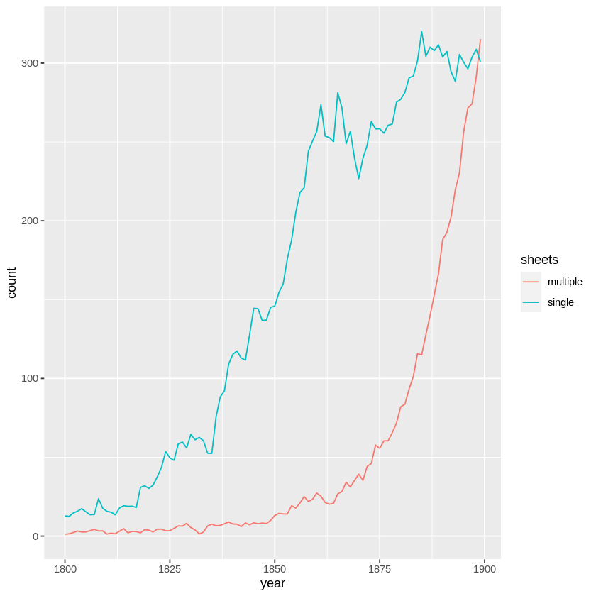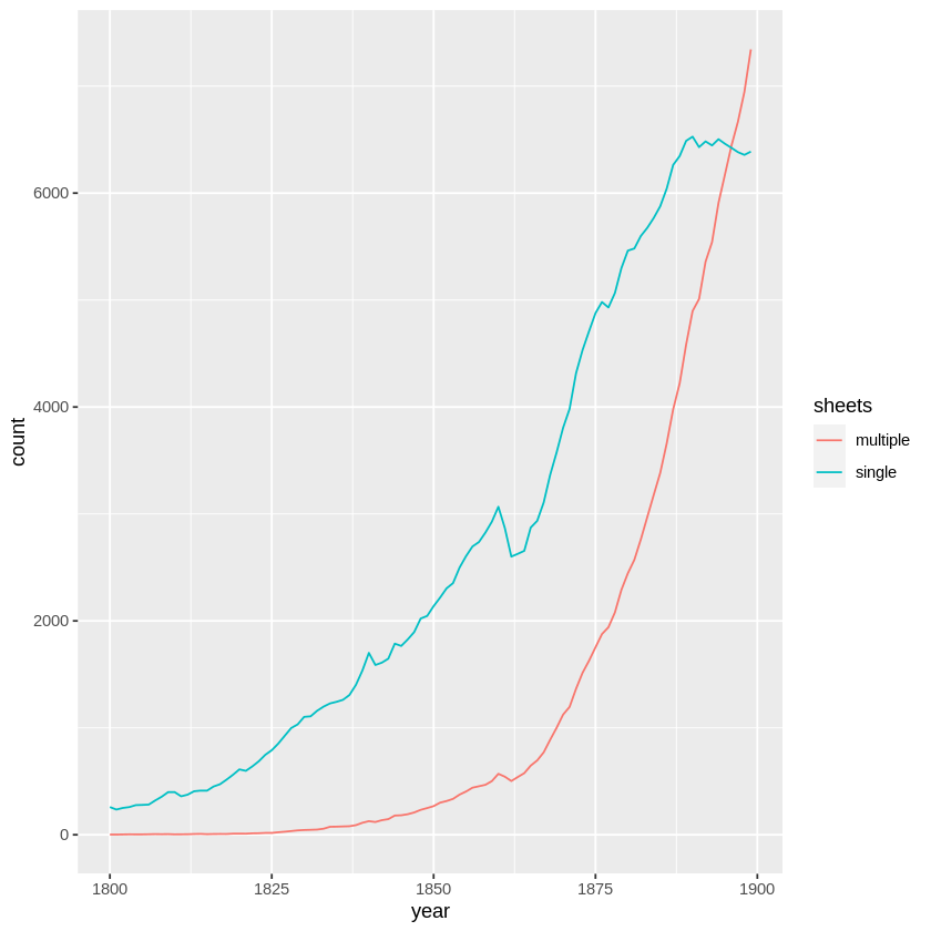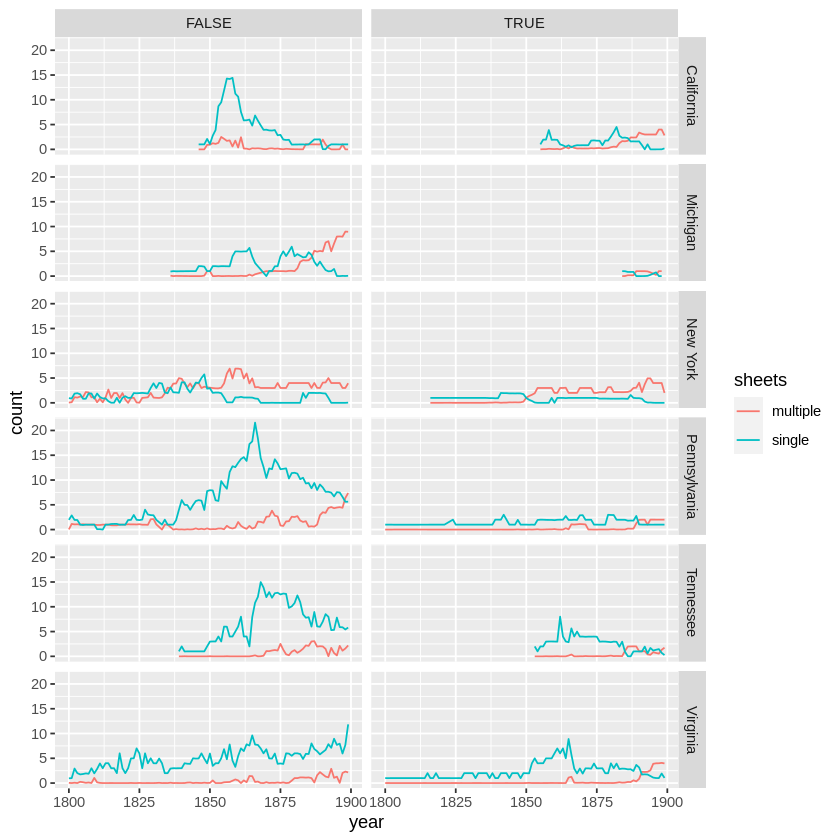 Although the probability that an editor in the U.S. would publish a single-sheet issue descreased after 1850, the absolute number of distinct newspaper series, as we saw above, was sharply increasing. A plot of the counts of single-sheet and multiple-sheet papers in the digitized sample thus shows a further rise in the absolute number of single-sheet papers after the Civil War and then a plateau until the century’s end. Multiple-sheet papers, meanwhile, grew much faster from a lower baseline and, in aggregate, overtook single-sheet papers around 1898. In other words, it seems, from our digitized sample, that single-sheet papers were not losing popularity so much as ceasing to grow. This data-driven account aligns in some ways with standard historiography, which traces a movement toward longer and longer papers, it nuances that account by showing that the overall growth of the medium perhaps obscures the continued prevelance of the four-page paper through the century.