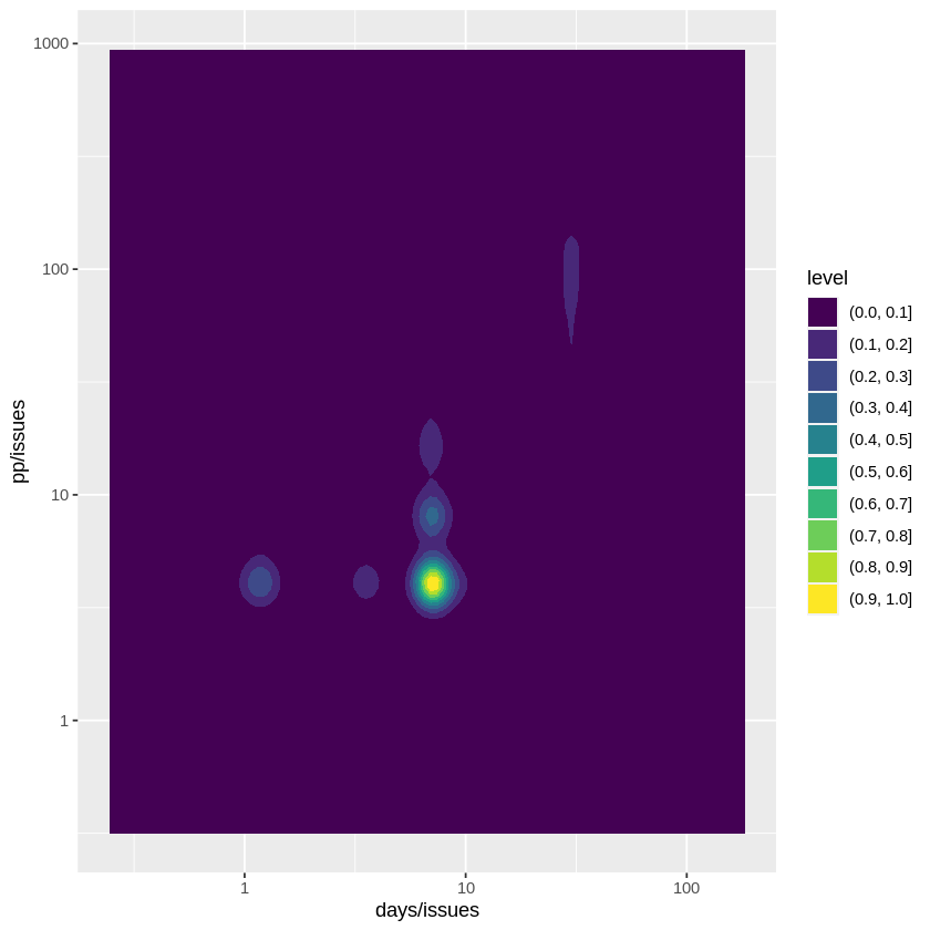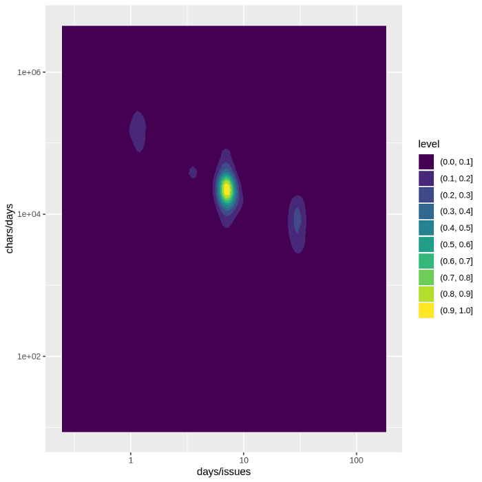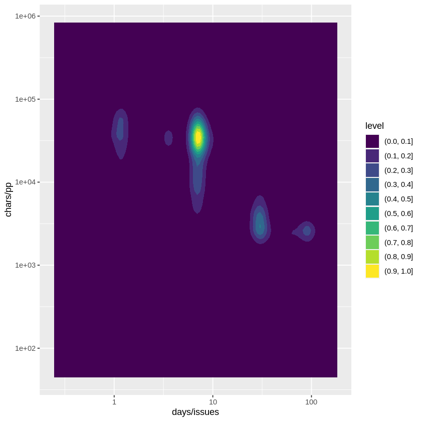 In general, there is a clear (negative) correlation between the number of days between issues and the number of characters published per day. On both dimensions, these distibutions have low overlap.