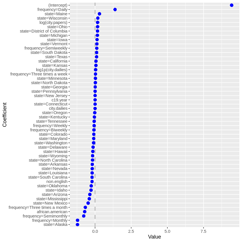 Besides the intercept of the linear model, which captures the average log characters per day, we see, unsurprisingly, that dailies have relatively higher output and weeklies and less frequent papers have lower output when normalized by number of days. The Black and non-English press have relatively lower rates of output. Newspapers also tend to have higher output when published in the same city as many newspapers or many dailies.