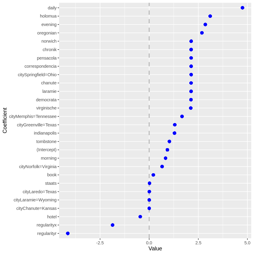 Although the primary purpose of this predictive model is to correct for sampling bias, we can still observe some patterns in model coefficients. The African-American and non-English features are positive, suggesting that these papers are more likely, all else being equal, to be published on single sheets. Not surprisingly, papers with a quartly, monthly, semimonthly, and other less frequent publication schedule are less likely to be single-sheet issues, as suggested by the negative regression coefficients. Publication in New York is negatively correlated with single-sheet publication, while publication in Nevada is positively correlated.