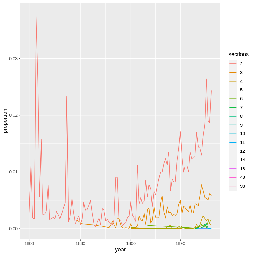 Once issues run over sixteen pages, however, the number of distinct page counts increases. This may be related to more complex collations in multiple newspaper sections. Data on multiple sections in newspaper issues is only found in our data in Chronicling America. Even there, many of the multiple sections are extras appended to the main issues in the archive, rather than sections folded and distributed together. In any case, multiple sections almost never exceed 2% of all issues during the nineteenth century.