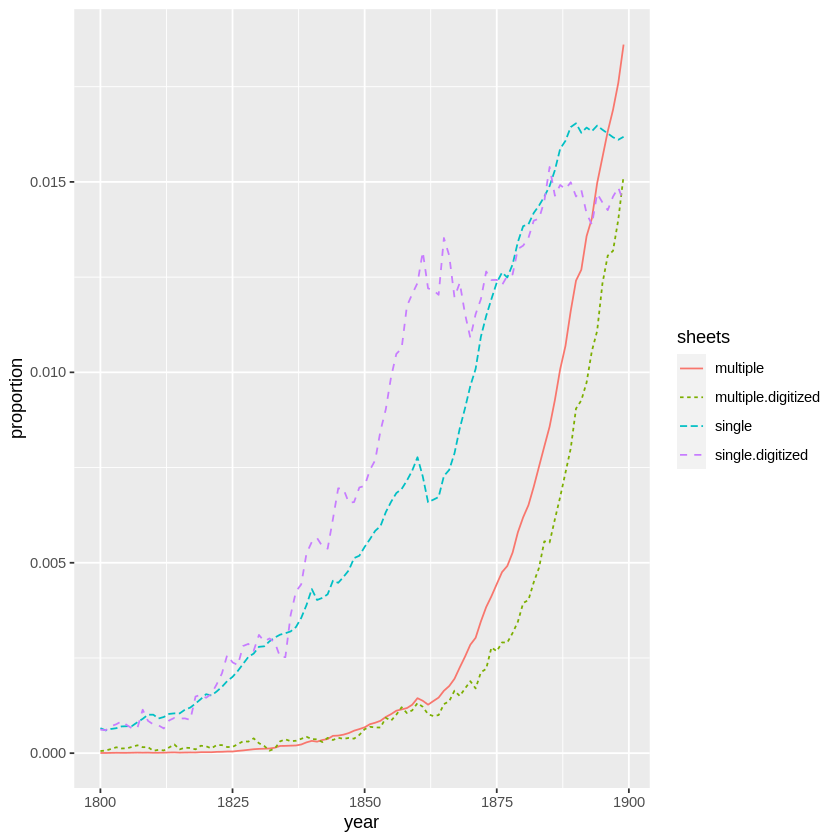 We now plot the expected counts of single-sheet and multiple-sheet papers in the USND. Unlike the graph of the digitized sample, we see substantial growth in single-sheet papers after the dip during the Civil War and a later plateau. Again, this subtly counters received wisdom by showing that shorter papers did not decline in the latter half of the century, and in fact they grew. The perception of their decline is tied more to the exponential growth of the newspaper category, such that single sheet papers prominence relative to other formats dipped, than it is to the single-sheet format’s raw decline in prevalence.