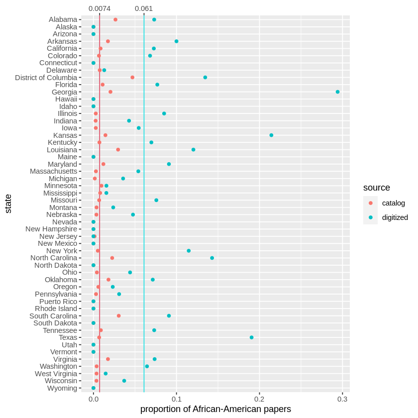 Displaying the same data in another way, we can see that the proportion of papers digitized varies greatly among states, and is often quite far from the overall rate of digitization of 5% indicated by the vertical line.