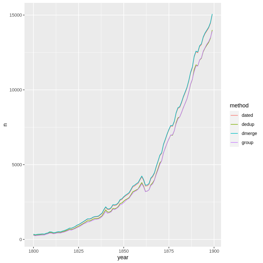 Here we plot the overall effect of these transformations of the catalog over the course of the nineteenth century. Removing duplicates reduces the estimate by a small but significant amount after about 1840. Although one effect of grouping related series is to reduce the estimate for some years, a countervaling effect is to increase the number of newspapers for which we have known years. Because the date at which one paper gave way to its successor might be uncertain, we can increase the number of known dates by merging these adjacent series.