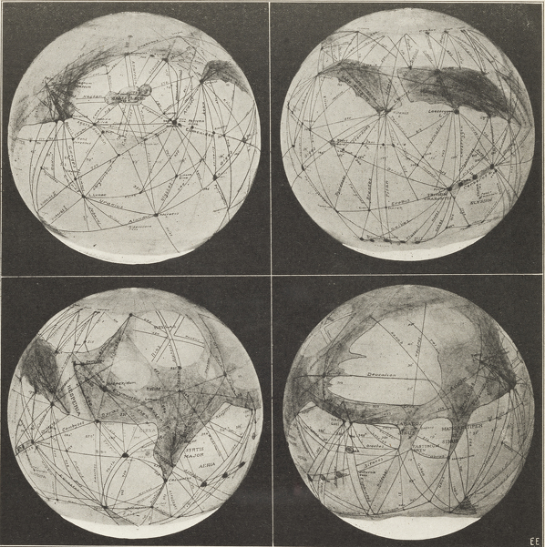 Figure 1. “Four different views of the planet Mars. As Mars turns on its axis once every 24 hours the same as the earth, we are enabled to see the entire surface of the Martian globe during that time. The four views, as shown, are therefore taken six hours apart from each other. These pictures were made during the last “opposition” in 1911, when Mars was some 47 million miles distant from the earth. It never comes nearer than 35 million miles to the earth. In 1924 the two planets will be but 35 million miles apart. In the views shown, the top is south, the bottom north, for through the telescope all objects are turned upside down. The white patch at the bottom is the north Polar snow cap, the southern cap is not in evidence for it has melted already. The melted water has been conducted equatorward by the “canals.” Note that the canals run through the dark areas, which are not oceans therefore, but land with vegetation. The light areas are deserts. Nearly all canals are perfectly straight, the ones near the edges of the pictures appear curved only because we are looking on a globe and not on a plane surface. Photos courtesy of Prof. Percival Lowell, Flagstaff Observatory, Flagstaff, Ariz.”