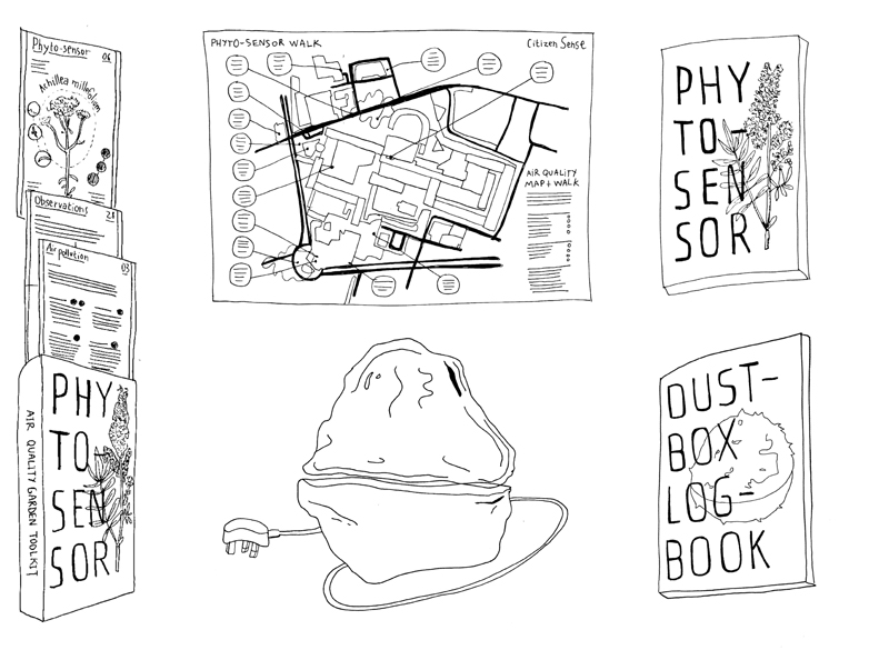 Figure T4.1. Phyto-Sensor Toolkit developed by Citizen Sense for developing air quality gardens and monitoring air quality. Illustration 1 by Sarah Garcin, photograph by Citizen Sense, courtesy of Citizen Sense. This toolkit can be found in a more extensive form in the Resource section of this project.